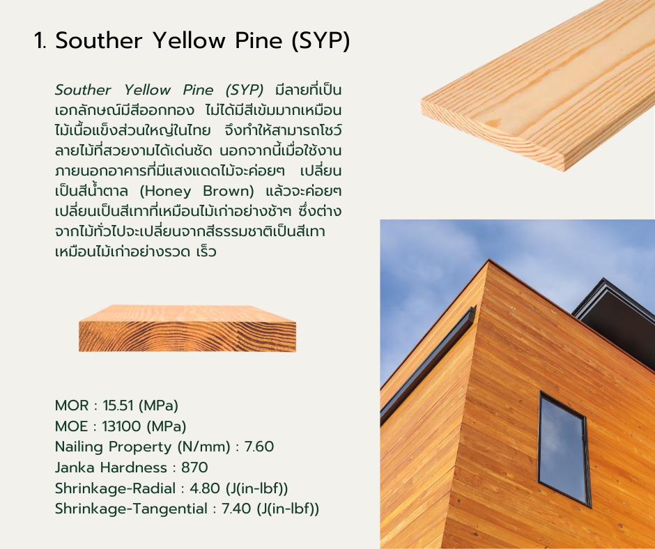 ไม้สน SYP มีลายที่เป็นเอกลักษณ์มีสีออกทอง ไม่ได้มีสีเข้มมากเหมือนไม้เนื้อแข็งส่วนใหญ่ในไทย จึงทำให้สามารถโชว์ลายไม้ที่สวยงามได้เด่นชัด นอกจากนี้เมื่อใช้งานภายนอกอาคารที่มีแสงแดดไม้จะค่อยๆ เปลี่ยนเป็นสีน้ำตาล (Honey Brown) แล้วจะค่อยๆ เปลี่ยนเป็นสีเทาที่เหมือนไม้เก่าอย่างช้าๆ ซึ่งต่างจากไม้ทั่วไปจะเปลี่ยนจากสีธรรมชาติเป็นสีเทาเหมือนไม้เก่าอย่างรวดเร็ว