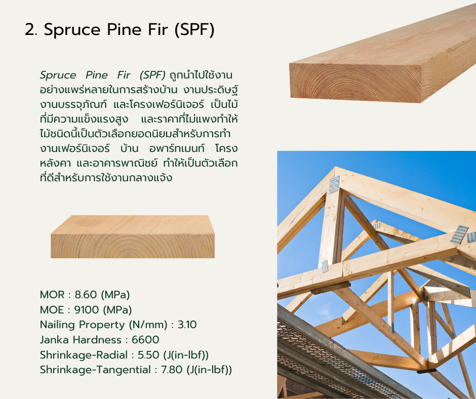ไม้สน SPF ถูกนำไปใช้งานอย่างแพร่หลายในการสร้างบ้าน งานประดิษฐ์ งานบรรจุภัณฑ์ และโครงเฟอร์นิเจอร์ เป็นไม้ที่มีความแข็งแรงสูง และราคาที่ไม่แพงทำให้ไม้ชนิดนี้เป็นตัวเลือกยอดนิยมสำหรับงานเฟอร์นิเจอร์ บ้าน อพาร์ทเมนท์ โครงหลังคา และอาคารพาณิชย์ ทำให้เป็นตัวเลือกที่ดีสำหรับการใช้งานกลางแจ้ง