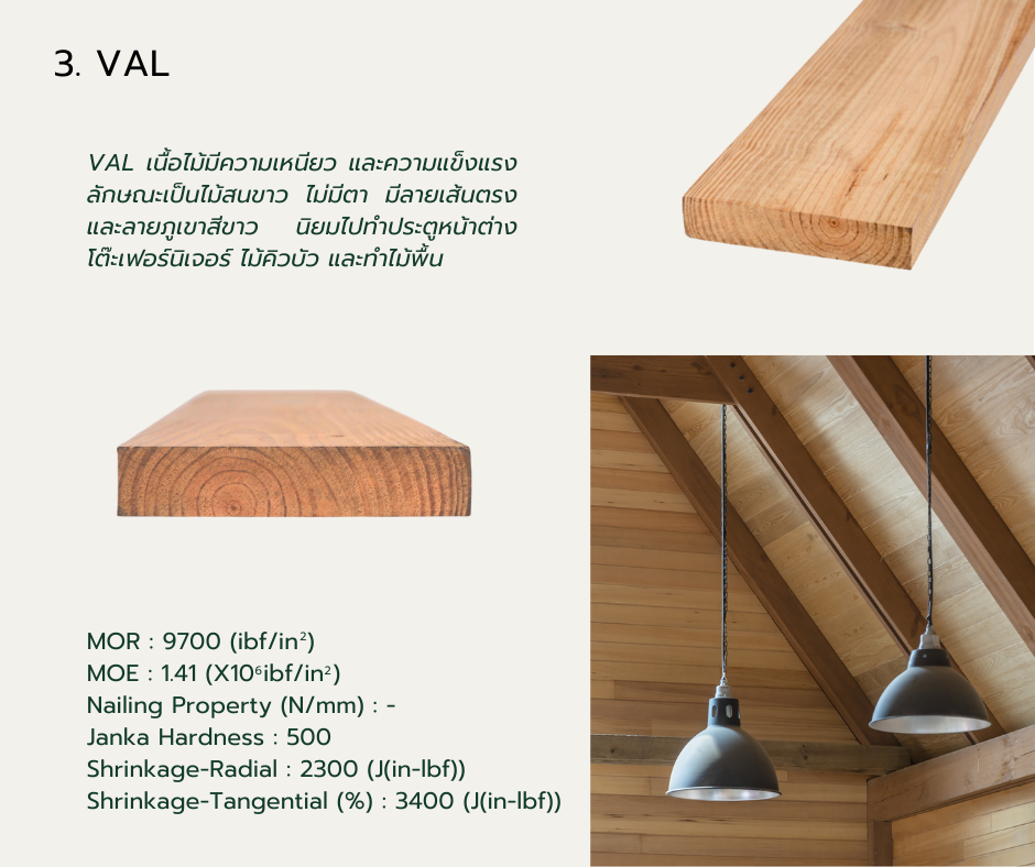 ไม้สน VAL เนื้อไม้มีความเหนียว และความแข็งแรงลักษณะเป็นไม้สนขาว ไม่มีตา มีลายเส้นตรง และลายภูเขาสีขาว นิยมไปทำประตูหน้าต่าง โต๊ะเฟอร์นิเจอร์ ไม้คิวบัว และทำไม้พื้น