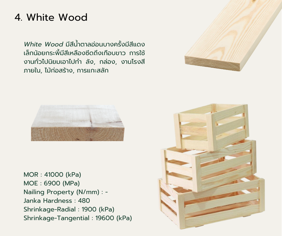 ไม้สน White Wood มีสีน้ำตาลอ่อนบางครั้งมีสีแดงเล็กน้อยกระพี้มีสีเหลืองซีดถึงเกือบขาว การใช้งานทั่วไปนิยมเอาไปทำ ลัง, กล่อง, งานโรงสีภายใน, ไม้ก่อสร้าง, การแกะสลัก