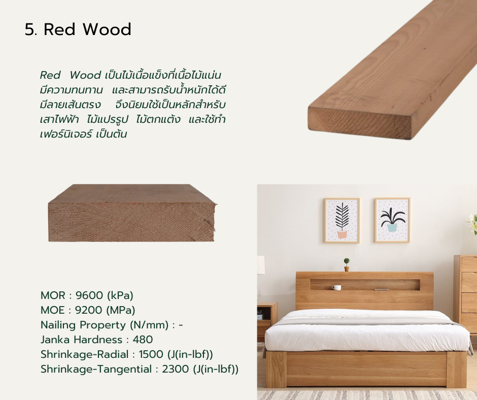 ไม้สน Red Wood เป็นไม้เนื้อแข็งที่เนื้อไม้แน่น มีความทนทาน และสามารถรับน้ำหนักได้ดี มีลายเส้นตรง จึงนิยมใช้เป็นหลักสำหรับเสาไฟฟ้า ไม้แปรรูป ไม้ตกแต้ง และใช้ทำเฟอร์นิเจอร์ เป็นต้น