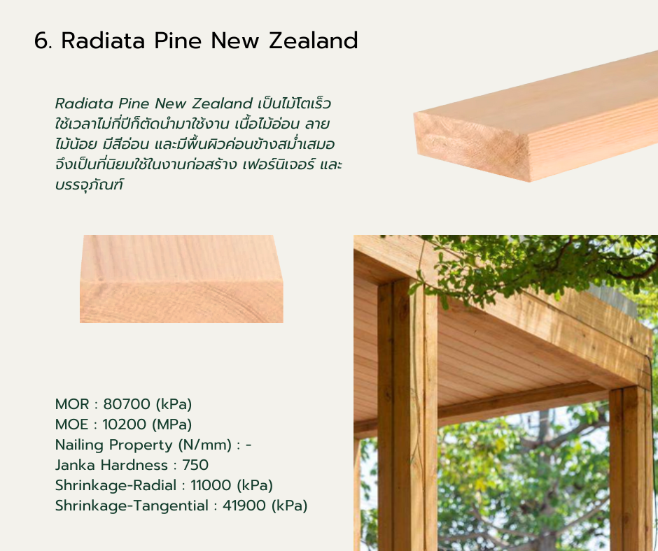 ไม้สนนิวซีแลนด์ เป็นไม้โตเร็ว ใช้เวลาไม่กี่ปีก็ตัดนำมาใช้งาน เนื้อไม้อ่อน ลายไม้น้อย มีสีอ่อน และมีพื้นผิวค่อนข้างสม่ำเสมอและแข็งแรง สามารถใช้งานได้หลากหลาย ทั้งงานก่อสร้าง ซุ้มไม้ ศาลา บังกะโลหลังเล็กๆ เสาป้าย เฟอร์นิเจอร์ รวมทั้งงานไม้ D.I.Y