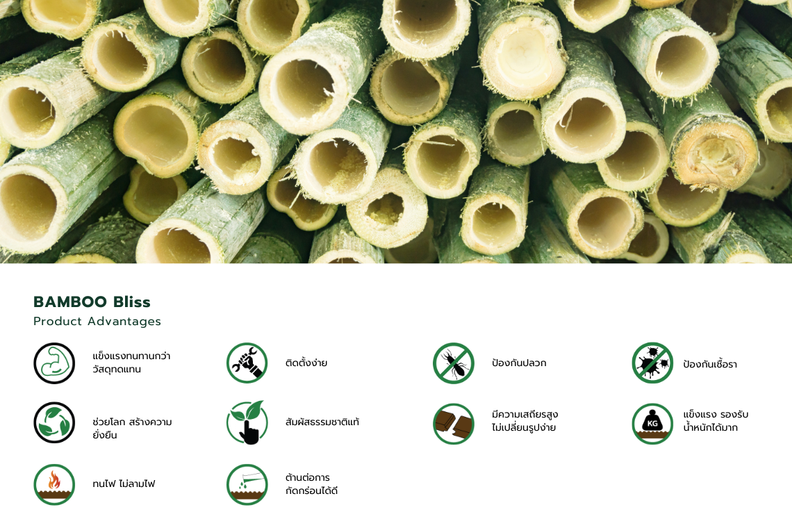 ไม้ไผ่ Thermo เป็นนวัตกรรมใหม่และเป็นมิตรกับธรรมชาติ ช่วยเพิ่มความสวยงามและการใช้งานในพื้นที่ต่างๆ ทำจากไม้ไผ่ที่ผ่านการปรับเปลียนคุณสมบัติด้วยความร้อน ทำให้มีความทนทาน มั่นคง และสามารถต้านทานต่อปัจจัยด้านสิ่งแวดล้อมได้ดียิ่งขึ้น