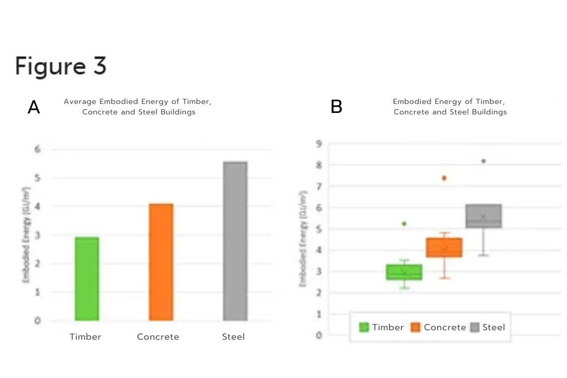 จากตาราง พบว่าอาคารไม้มีพลังงานที่ฝังอยู่น้อยที่สุด โดยเฉลี่ยแล้ว พลังงานที่ฝังอยู่ในอาคารไม้ต่ำกว่าอาคารคอนกรีต 28% และต่ำกว่าอาคารเหล็ก 47% ตามลำดับ